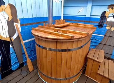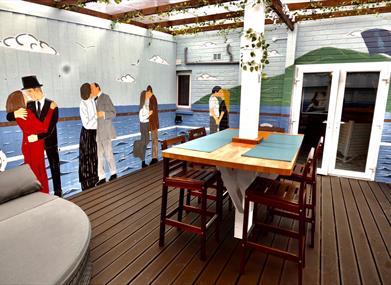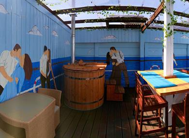 A hand made hot tub with small ships, sitting area, an outdoor grill all in the “Kissing room” on the deck of the Titanic.