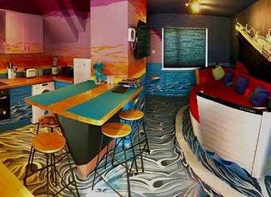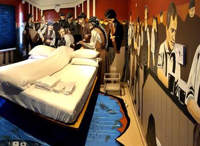 Rather than watching a film or reading a book we build the world so the guests are living, sleeping, interacting, moving around and become and part of the actual story for their stay in Belfast and Northern Ireland. We create a world of love, hopes, smiles, glamour and dreams from the Titanic's ill-fated journey. The hand crafted and painted throughout theme follows our Titanic inspired story from the launching in Belfast, to the dramatic sinking of the ship.
