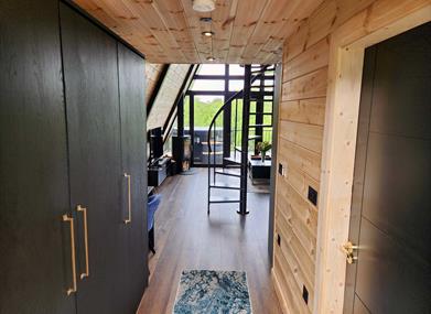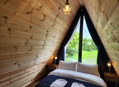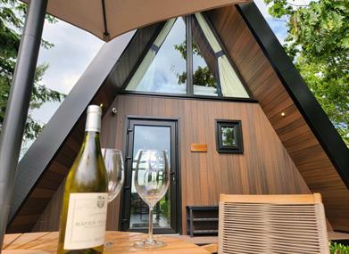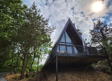 Perched on a rocky outcrop with stunning views of a serene pond and an abandoned stone cottage in the distance, Rockwater Luxury Lodge offers a perfect blend of nature and elegance. This A-frame wooden lodge features a private decking area with a wood-burning hot tub and seating. Inside, the spacious open-plan design includes a cozy living area with a log-burning stove, a fully equipped kitchen, and dining for two.
