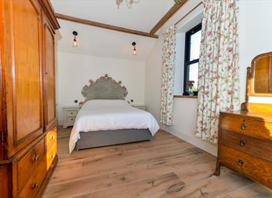 In the cottage there is a large kitchen, dining, living room with a wood burning stove and large windows overlooking the garden and the surrounding countryside. The kitchen is fully equipped with everything you will need. There is a main bedroom with a king bed and a second twin bedroom with two singles.