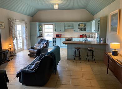 Tastefully decorated new build farm cottage with underfloor heating, wood burning stove and traditional painted kitchen with outstanding views towards the north coast, and Serengeti sunsets.