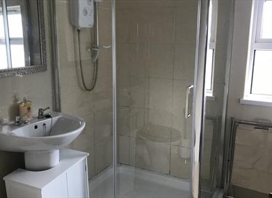 Shower room: Large electric shower/heated towel rail/washer dryer