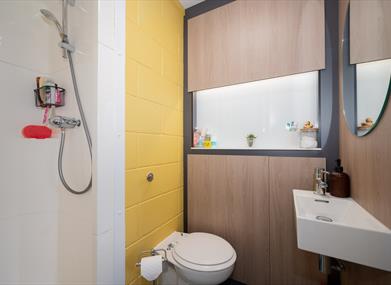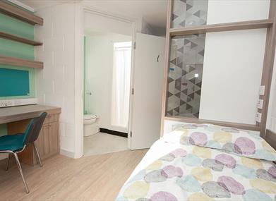 Rooms are in low rise accommodation blocks of three floors with a common room, kitchen and television available on each floor. The en suite guest rooms feature simple, modern decor. This includes Wi-Fi, a desk and chair, and private bathroom with shower.