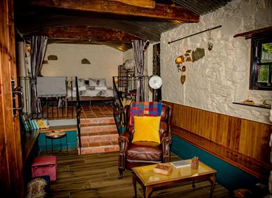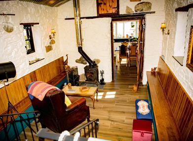 The sitting room is unique, oozes warmth and coziness - reclining leather armchair, wooden cushioned benches, foot stools, stained glass window and a wood burning stove.