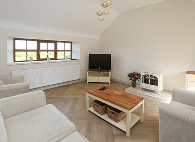 The living room has comfy seating for everyone and a cozy electric stove to snuggle in front of on cold winter nights.