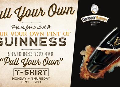 Pull Your Own Pint of Guinness (Guinness t-shirt, photograph in front of the Guinness Gate, Guinness certificate, Piece of Irish Peat in a branded bag. £10.00 pp. Monday to Thursday 3pm - 6pm).