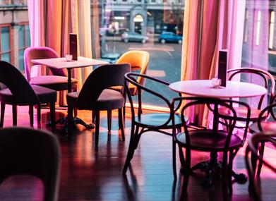 Their front bar, The Library, occupies two floors, both ground and first floor, with a continental feel which is different from anywhere else in the city. The ground floor café bar offers a great range of teas, coffee & wine, beer & spirits. Why not try their Flight Boards, featuring 3 x 100ml wines of your choice for a unique wine tasting experience. The upstairs cocktail bar with its very own curated cocktail list opens at the weekend, and with its vista from our first-floor windows, it is the best seat in town.