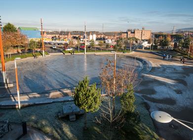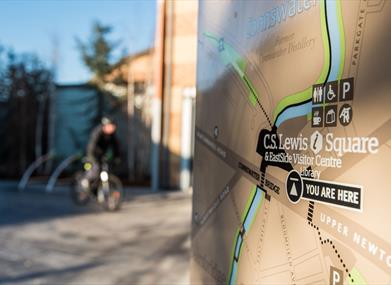 CS Lewis Square is located at the intersection of the Connswater and Comber Greenways, beside the EastSide Visitor Centre, where visitors can access information on the city's attractions from interactive screens, interpretative panels and a wall map, connecting people to EastSide's famous faces, places and industries.