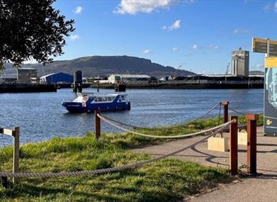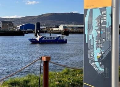 Journeys commence and end from the pontoon at the rear of AC Marriott Donegall Quay, passing the Big Fish.