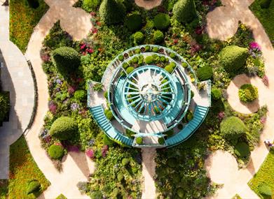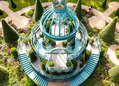 The floral tapestry has a classical architecture style, created to mark the Coronation of His Majesty King Charles lll and Queen Camilla. The garden has been planted in a pollinator-friendly and sustainable way, reflecting some of the great loves of His Royal Highness. The three-floor pavilion topped with a crown welcomes its guests with a musical performance of dancing topiary and spinning conical trees every 15 minutes, a true spectacle.